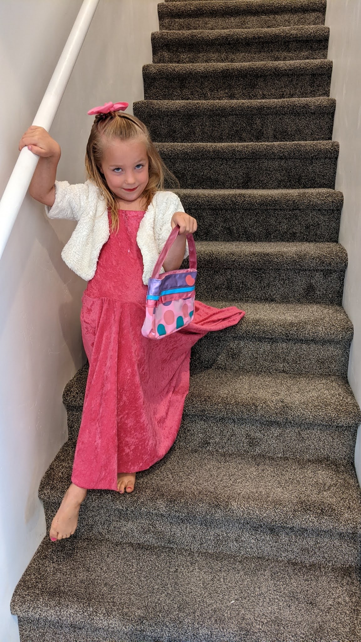 We set up our bathroom and gave her a makeover. She specifically requested makeup on her eyes and lips. We also painted her nails and let her pick out a special hairdo. We played ballet music (her request) while we did it. Then she put on a dress and picked out accessories.